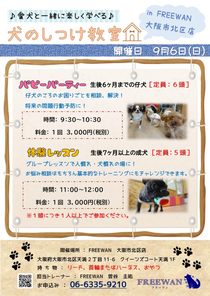 9月よりFREEWAN大阪市北区店にてしつけ教室の開催が決定いたしました!