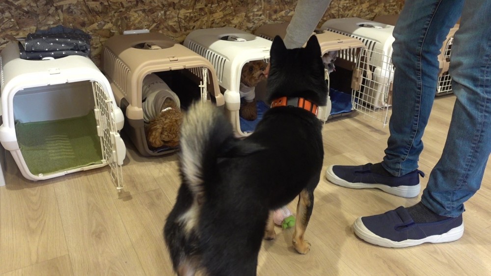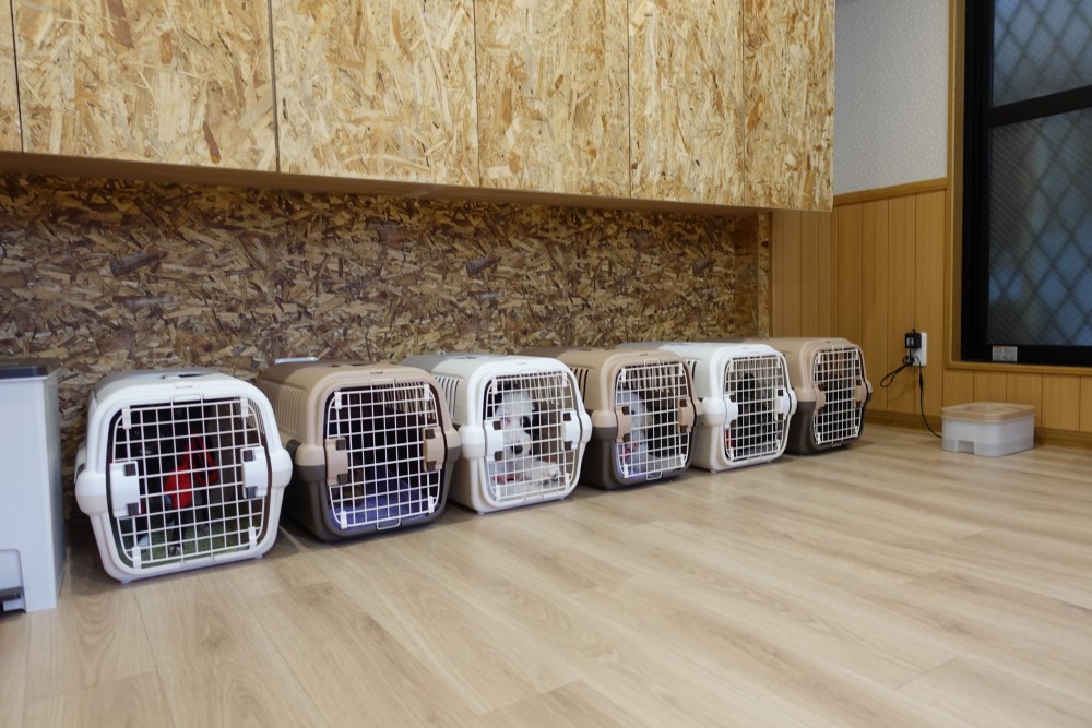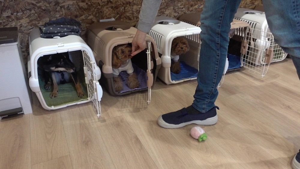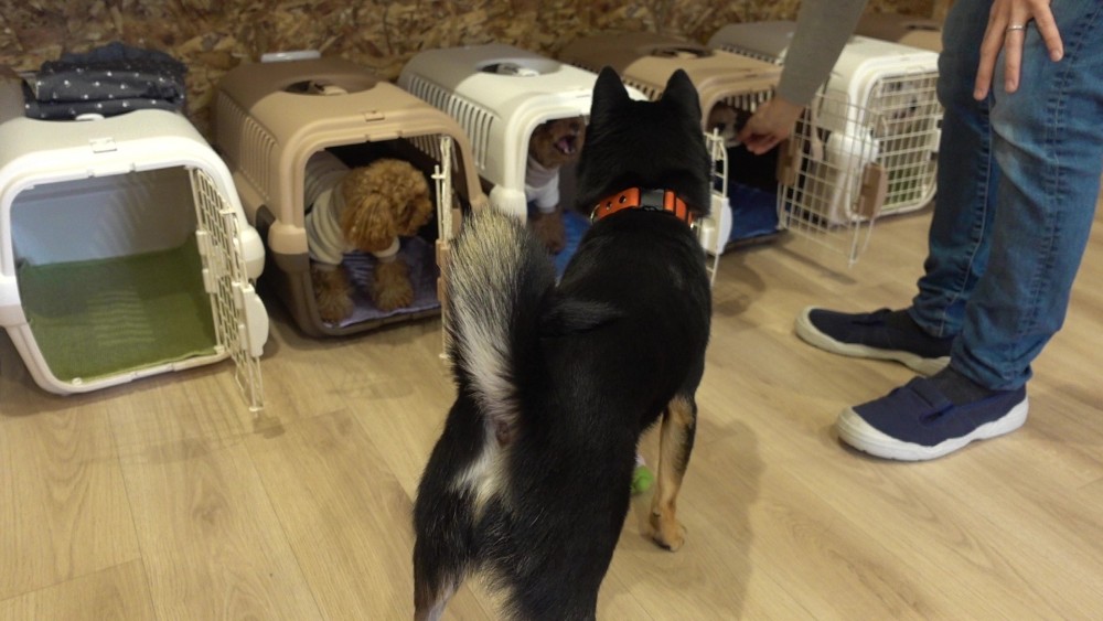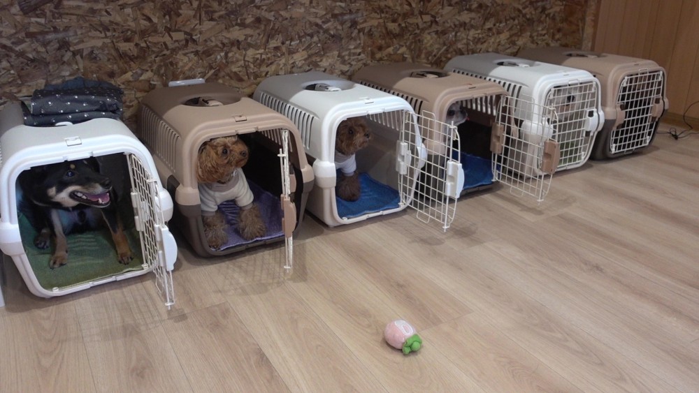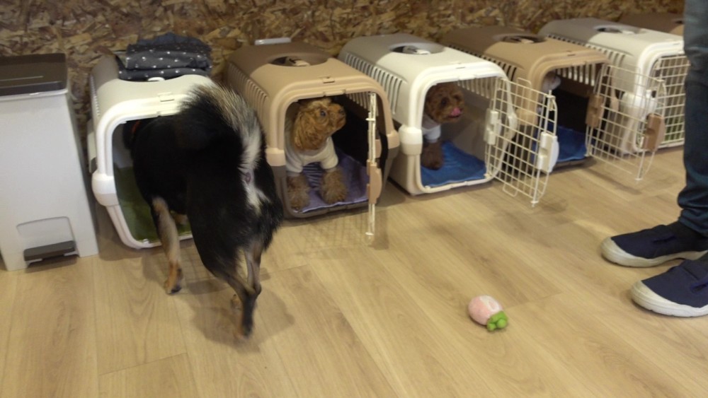 スクールではクレートに慣れてもらえるように様々な方法で練習をしています!