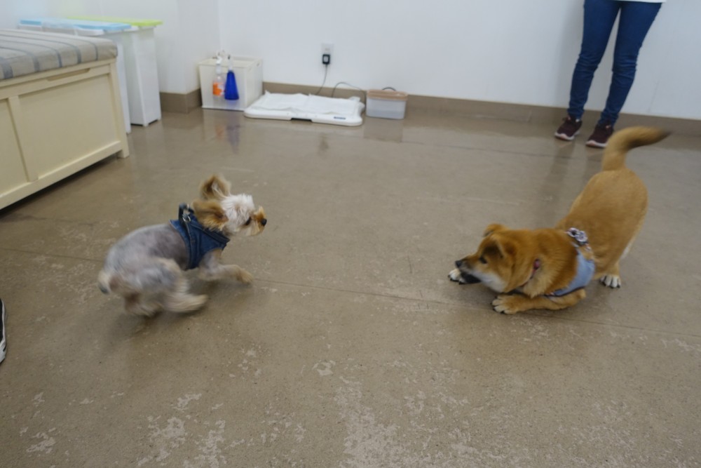 ヨークシャーテリアのおかきちゃんが一番さくらちゃんへアピールをしてくれていたのですが、今日一日でとっても仲良くなっていました♪