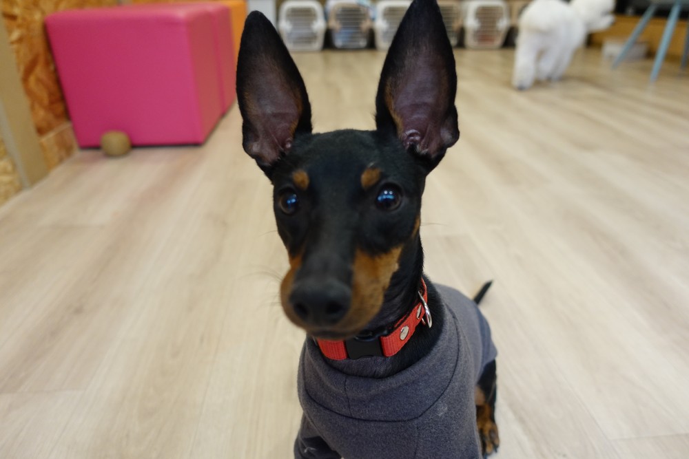 トイマンチェスターテリアのダラちゃん!おもちゃに目がなく、人がおもちゃ箱の前に行くと目をキラキラさせています✨