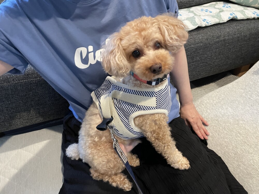 海くんの性格を見て少しずつ慣れさせる事が合っていると判断し、おやつを積極的に使いながらハーネスを巻くイメージを変えていける様に実践しております!